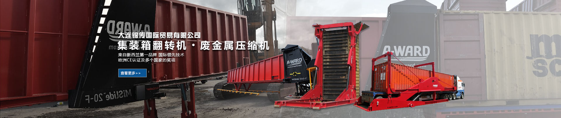大連錦傳國(guó)際貿(mào)易有限公司于2013年11月與新西蘭A Ward公司達(dá)成戰(zhàn)略合作,成功代理集裝箱翻轉(zhuǎn)機(jī)、廢金屬壓縮機(jī)等產(chǎn)品在中國(guó)大陸的銷售、維護(hù)及保養(yǎng)業(yè)務(wù)。本公司重合同、守信用,保證產(chǎn)品質(zhì)量,以經(jīng)營(yíng)多種特色的產(chǎn)品和薄利多銷的原則,贏得了廣大客戶的信任與厚愛。現(xiàn)長(zhǎng)期出口產(chǎn)品至澳大利亞,巴西,德國(guó),俄羅斯,哥倫比亞,美國(guó),泰國(guó),羅馬尼亞,新西蘭 ,意大利,越南,印度,印度尼西亞等國(guó)家。